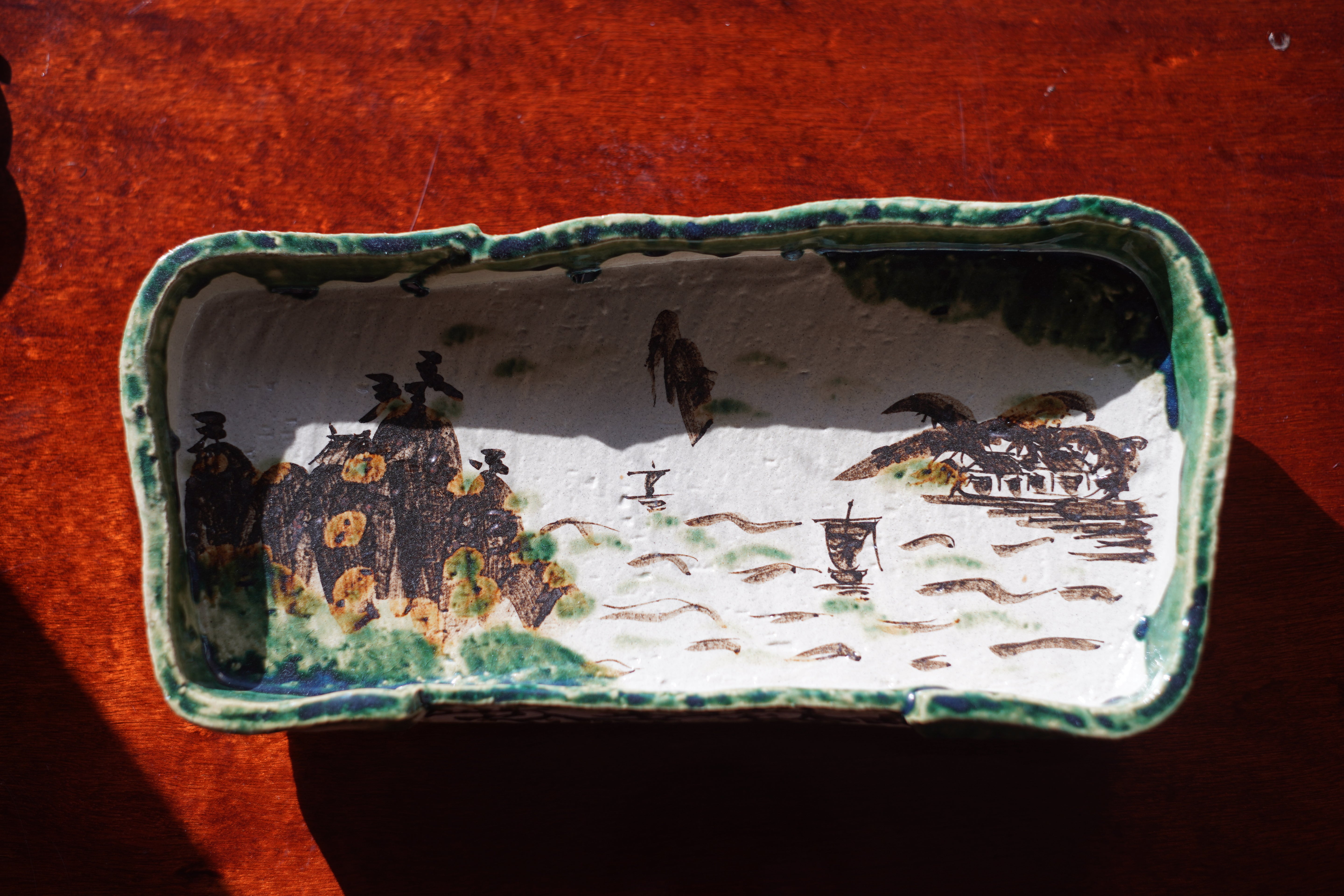 With Oribe, the vessel carries the season: the greens of moss and mountain shade, the smoky browns of earth, the dim light of dusk. Sometimes it speaks through painted animals and plants, sometimes through glaze that pools and breaks like weather. The food does not sit on Oribe; it enters its landscape.